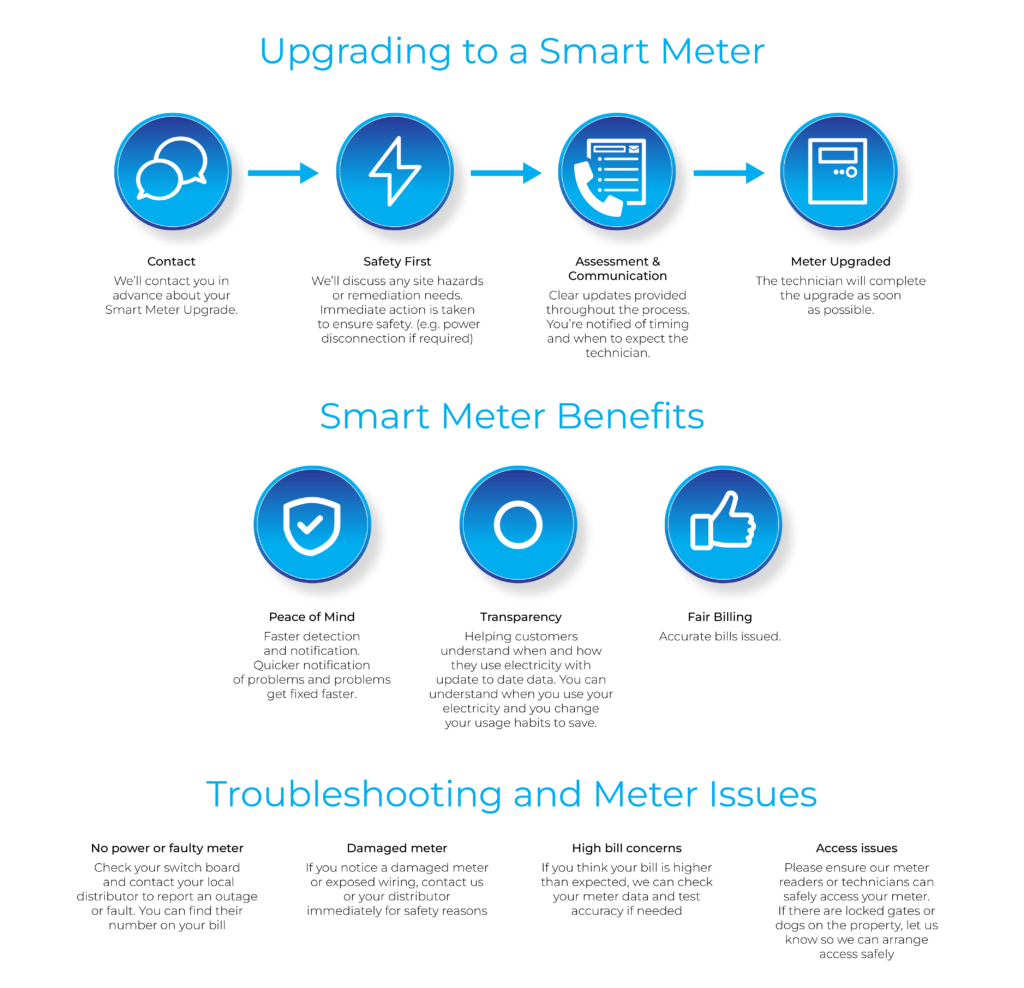 As part of Australia’s Accelerated Smart Meter Deployment, many customers will have their existing meters upgraded to smart meters over the coming years. Smart meters make it easier to manage your electricity, with faster connections, accurate readings, and access to near real-time usage information.